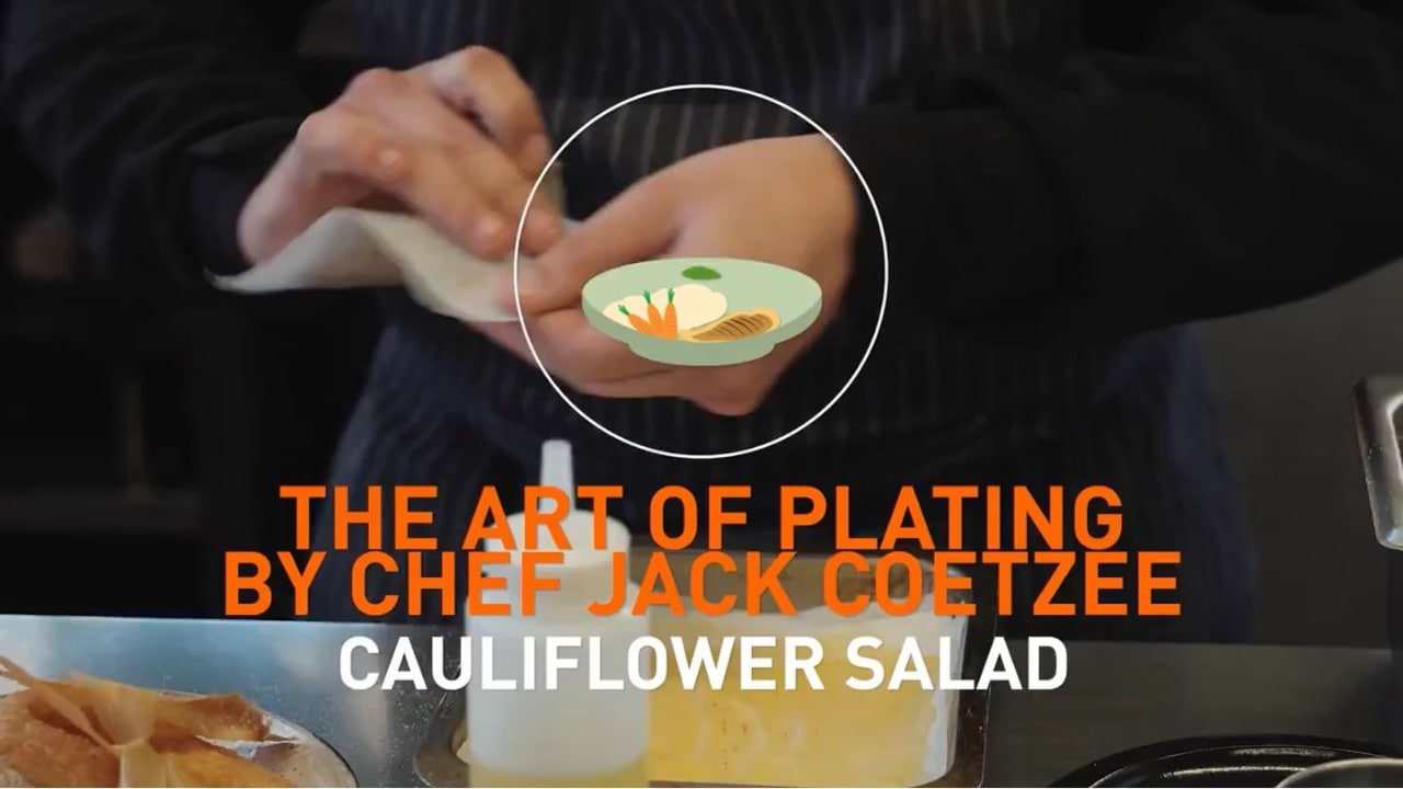 Con un plato rectangular y tonos monocromáticos, el chef Coetzee nos demuestra el emplatado de una ensalada de coliflor. Experimenta y visualiza el plato antes del emplatado para diseñar formas llenas de creatividad.